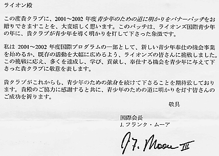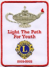 2001-2002年度中 フランク・ムーア国際会長は 多くを達成し、学び、寄与し、奉仕する機会を若者 に提供することによって、青少年のために道に明 かりを灯すよう、全世界のライオンズクラブに依頼 しています。 地元の地域社会で青少年のために指導の明かりを 提供するライオンズクラブは「青少年のための道に 明かりを」バナーパッチを受賞する資格を得ます。 バナーパッチは、2001年7月1日から2002年6月30日 の間にライオンズ青少年奉仕の機会の新しい活動を 少なくとも一つ始めたか既存の活動を著しく拡張し たライオンズクラブに贈られます。 |